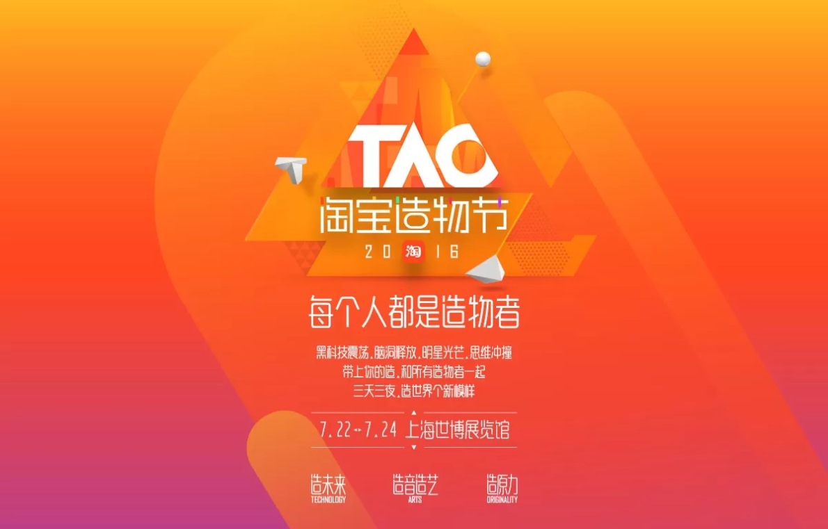 6月30日,淘宝方面对外证实,将于7月22日~7月24日三天于上海世博展览馆举办“淘宝造物节”,届时在三天时间里,造物节将围绕“T”、“A”、“O”三个主题板块,展示淘宝上最奇思妙想的设计原创、最炫酷的潮流时尚文化、以及全球最前卫的各色黑科技。